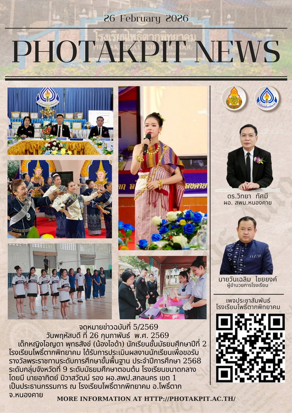วันพฤหัสบดี ที่ 26 กุมภาพันธ์ พ.ศ.2569 เด็กหญิงไอญดา พุทธสังข์ (น้องไอด้า) นักเรียนชั้นมัธยมศึกษาปีที่ 2 โรงเรียนโพธิ์ตากพิทยาคม ได้รับการประเมินผลงานนักเรียนเพื่อขอรับรางวัลพระราชทาน ระดับการศึกษาขั้นพื้นฐาน ประจำปีการศึกษา 2568 ระดับกลุ่มจังหวัดที่ 9
